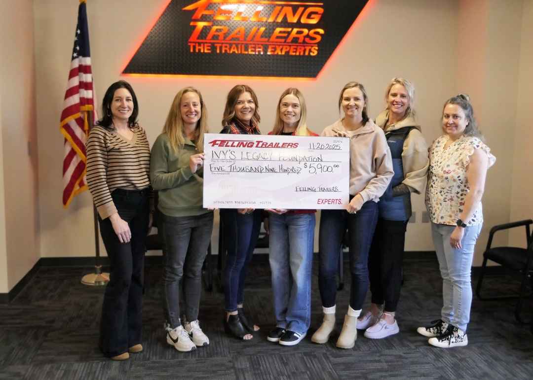 After taking possession of the trailer, Felling Trailers' owners presented the $5,900 donation to Ivy’s Legacy Foundation board members. “We are so honored to have been chosen as the 2025 recipient for the 2025 Trailer for a Cause. The proceeds from this one-of-a-kind trailer auction will go directly back to our community, and our board is honored to steward this contribution,” stated Nicki Vogt, founder of Ivy’s Legacy Foundation.