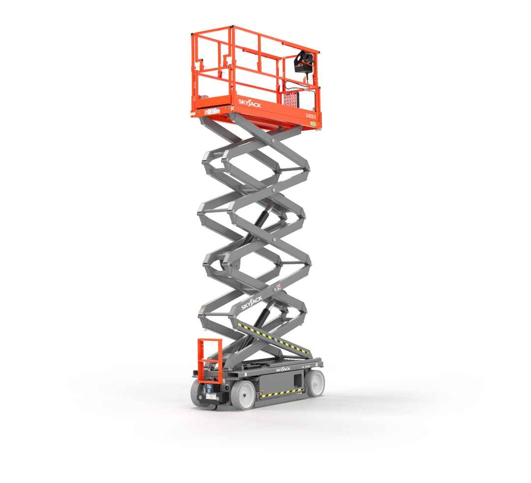 The Lift Guard Zone Lighting system uses red laser lights to create a visible boundary around the base of a scissor lift, about two feet from the chassis. The feature is designed to increase operator and bystander awareness in work zones, helping reduce the risk of collisions.