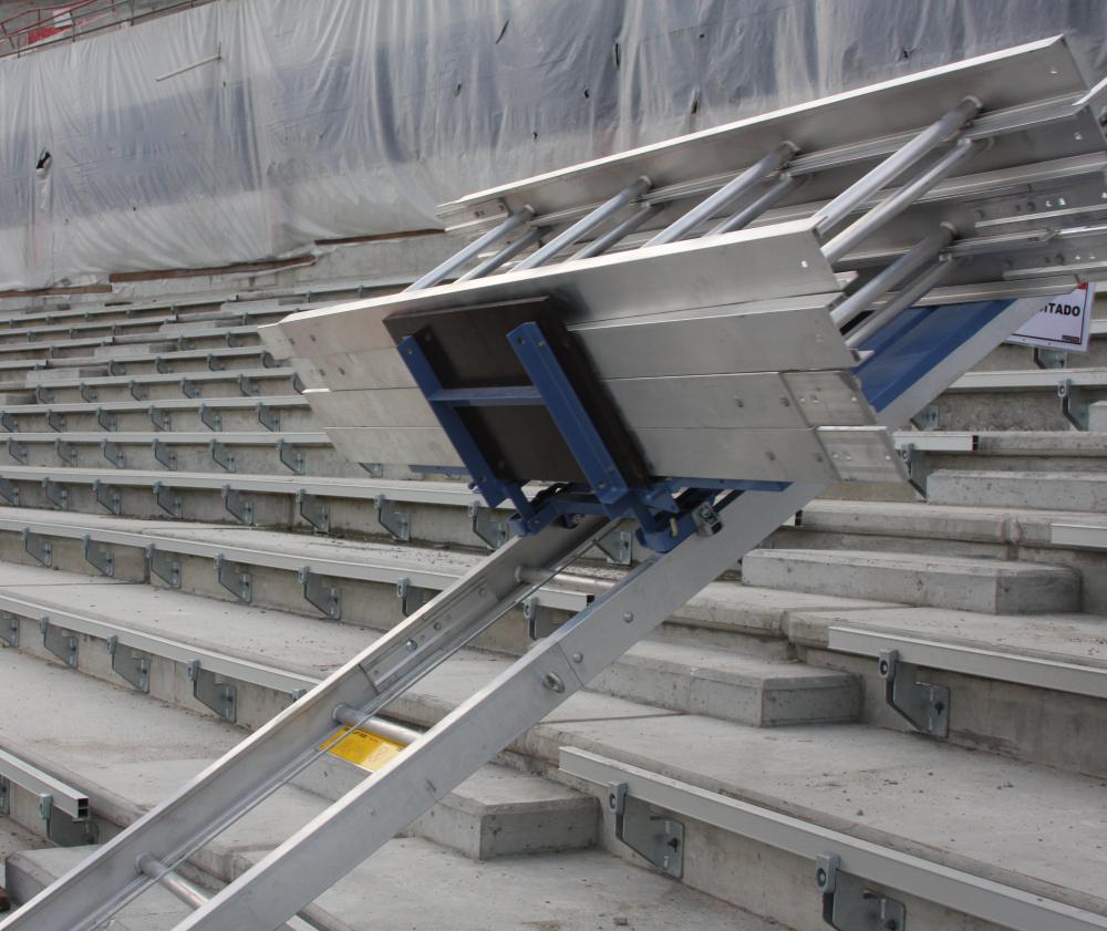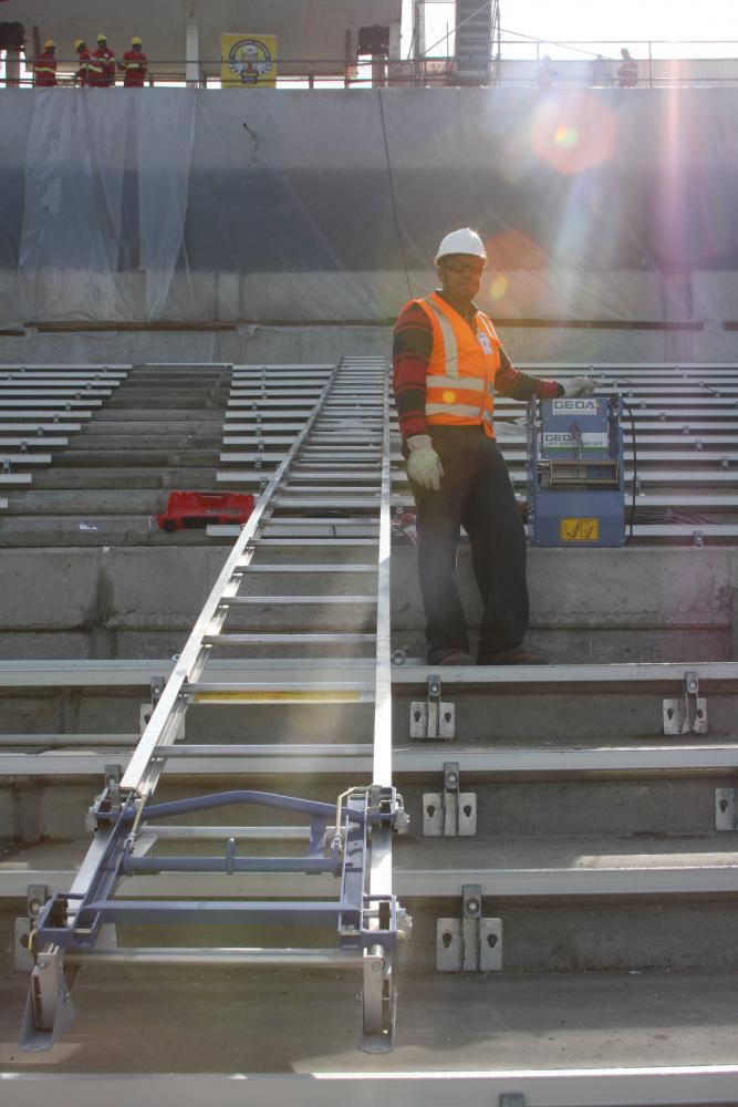 On the stands in the Beira Rio stadium, the special length inclined hoist from GEDA bridged 40 metres and was a valuable support tool. The GEDA Lift transported the metal fixings and seat shells into the various rows of the stadium stand. Laborious dragging along the steep rows was avoided, and the seats were transported efficiently and with less effort.