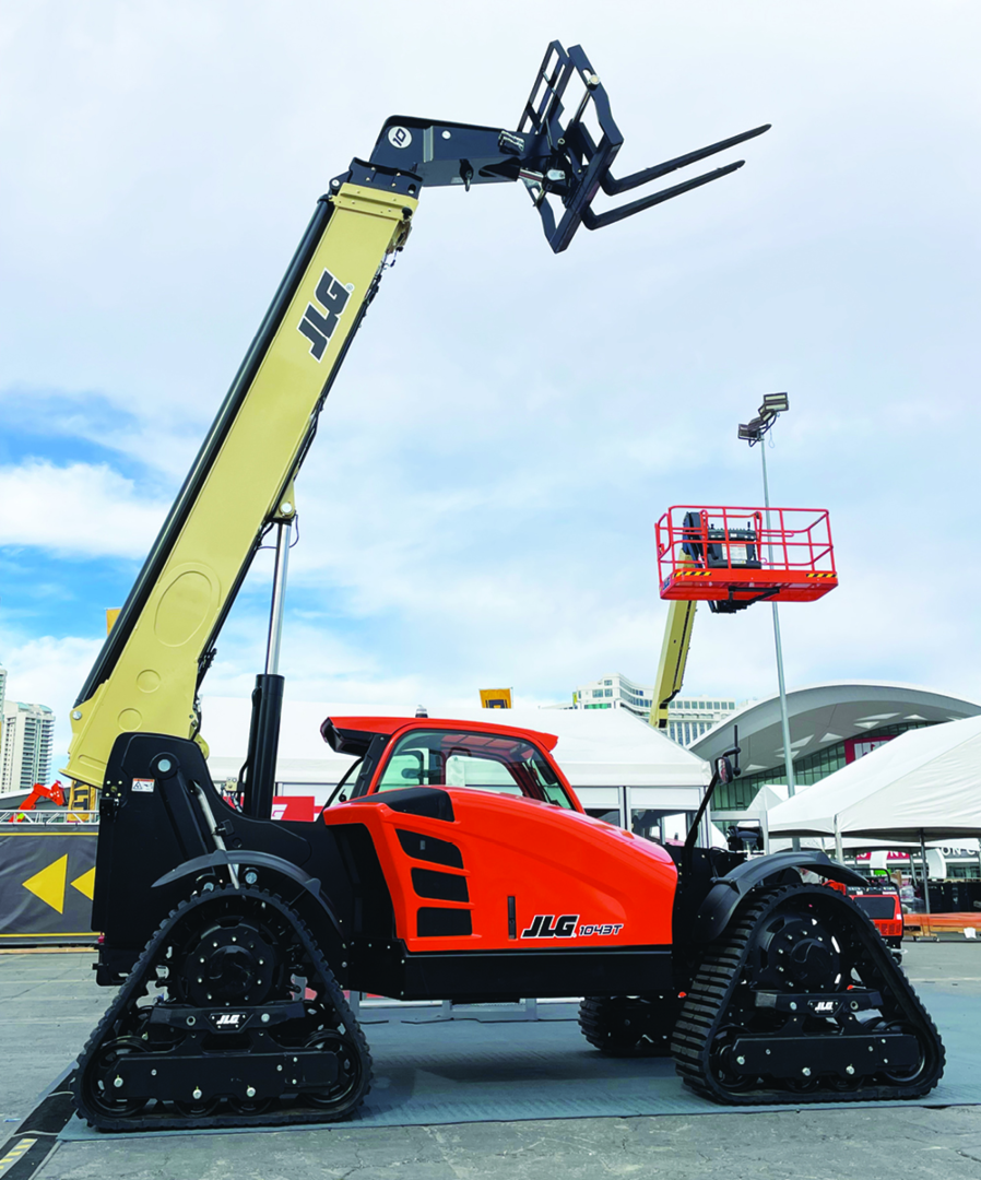 The concept model combines the reach and lifting capability of a traditional telehandler with a quad-track undercarriage engineered to enhance terrainability. The tracked configuration is designed to provide better flotation than tires and could help reduce the need for additional tracked equipment on certain jobsites. “Contractors are being asked to do more work in tougher conditions, and that’s exactly what inspired the innovation behind the 1043T Quad Track telehandler,” said Daryl Stauffer, director of product management – telehandlers, JLG.
