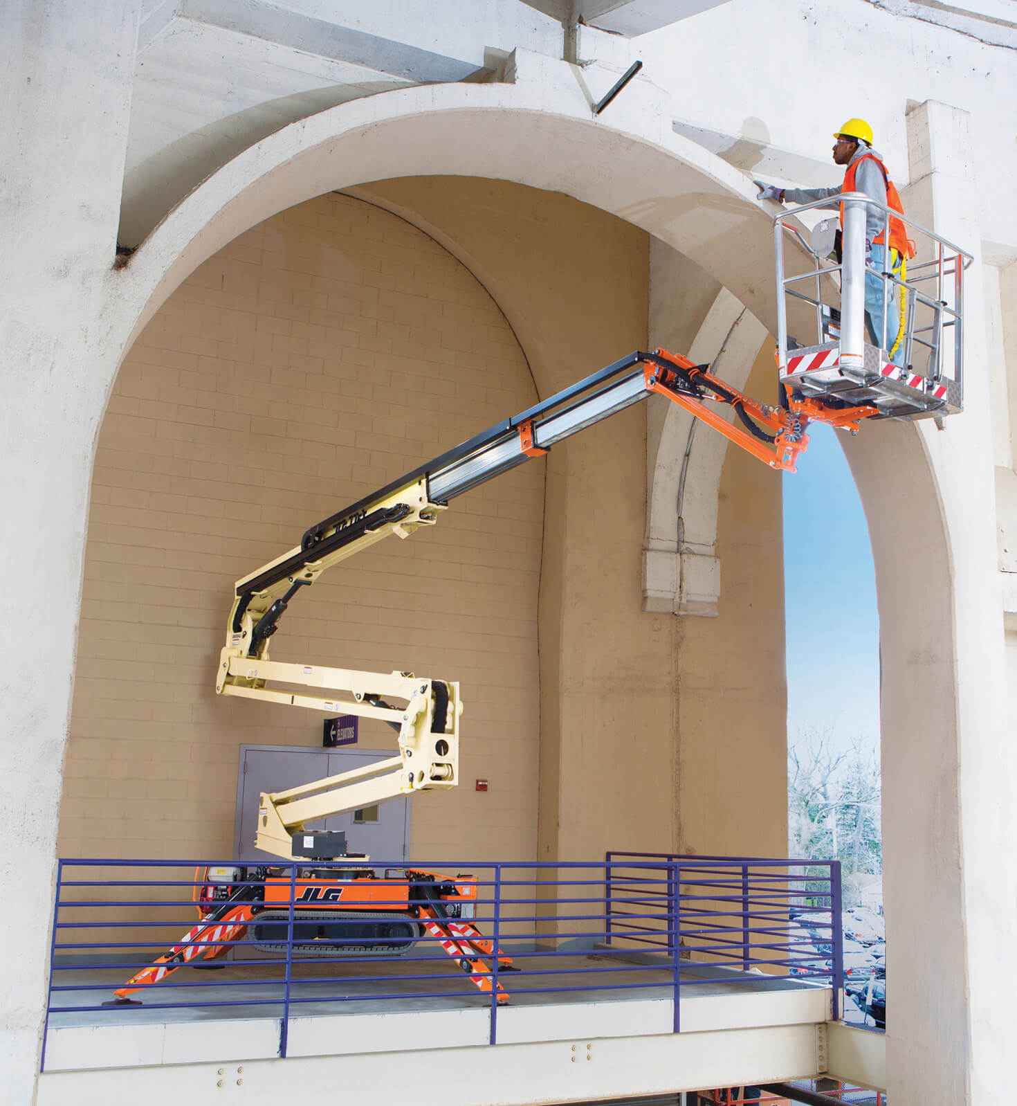 With these features, JLG compact crawler boom lifts are ideal for use in tough, hard-to-reach indoor and outdoor applications that require the operator to bring tools and materials to the work area, such as atriums, gymnasiums, arenas, auditoriums, airports, schools and universities, as well as city, state, federal and military facilities. These machines’ versatility and ease of mobility also make them well-suited for jobs performed in hotels and convention centers by window washers, painters, maintenance professionals, electricians and tree trimmers.